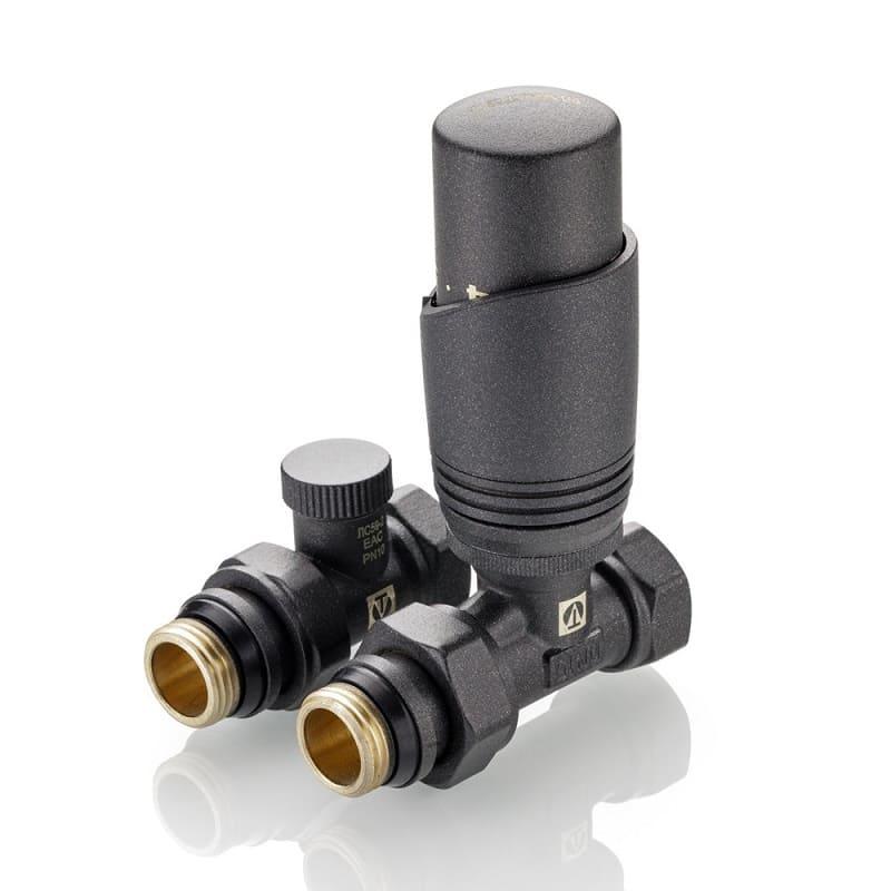 Клапаны и термоголовка комплекта выполнены в сером цвете