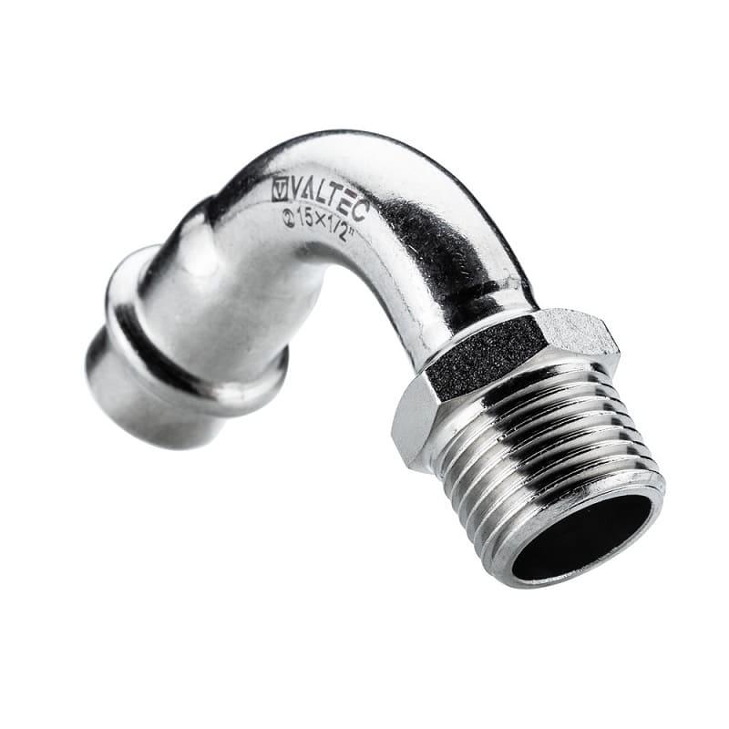 Пресс-отвод из нержавеющей стали с наружной резьбой обеспечивает соединение тонкостенной стальной трубы с резьбовым элементом монтируемой системы под углом 90°. Область применения – трубопроводы водоснабжения, отопления, иные инженерные и технологические установки с рабочей температурой до 120 °С и давлением до 16 бар.