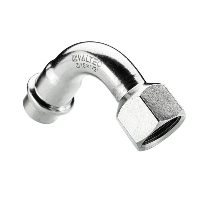 Пресс-отвод из нержавеющей стали с внутренней резьбой обеспечивает соединение тонкостенной стальной трубы с резьбовым элементом монтируемой системы под углом 90°. Область применения – трубопроводы водоснабжения, отопления, иные инженерные и технологические установки с рабочей температурой до 120 °С и давлением до 16 бар.