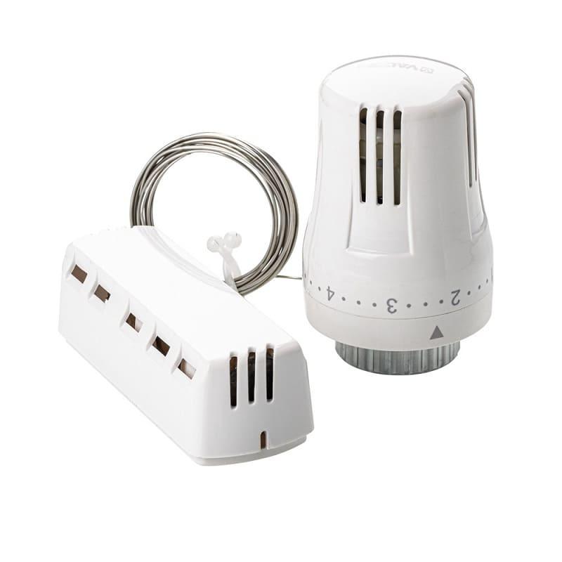 Жидкостная термостатическая головка с настенным датчиком предназначена для поддержания в помещении требуемой температуры воздуха путём регулирования расхода теплоносителя через отопительный прибор. Термочувствительный элемент предназначен для настенного крепления и соединен с термоголовкой капиллярной трубкой. Данное решение применяется в тех случаях, когда термоголовка установлена за плотной шторой, в нише, за экраном и температура воздуха вокруг неё не соответствует средней температуре воздуха в помещении.