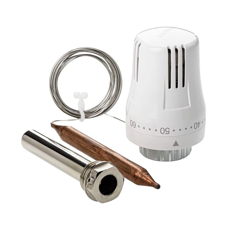 Жидкостная термостатическая головка с выносным погружным датчиком предназначена для поддержания требуемой температуры теплоносителя путём регулирования его расхода через термостатический клапан (двух- или трехходовой). Выносной датчик соединен с термоголовкой капиллярной трубкой. Датчик устанавливают в латунную гильзу (входит в компл. поставки) с наружной резьбой 1/2". Заданное значение температуры устанавливается в диапазоне от 20 до 60 °С. Присоединение термоголовки к клапану осуществляется с помощью накидной гайки с резьбой М30 х 1,5. Длина капиллярной трубки 2 м.
